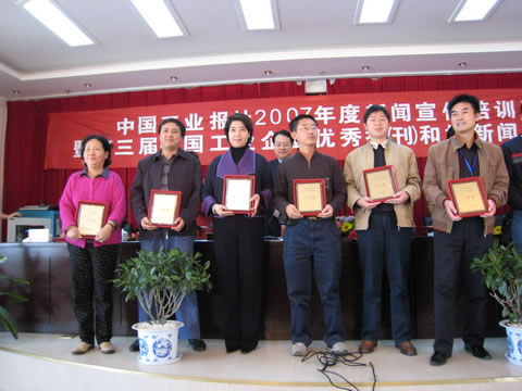 本報訊 日前,在云南省大理市召開的中國工業(yè)報社2007年度新聞宣傳培訓(xùn)班暨第三屆中國工業(yè)企業(yè)優(yōu)秀報刊和好新聞領(lǐng)獎大會上,我《杭機集團報》被評為中國工業(yè)企業(yè)2007年度優(yōu)秀報刊一等獎,其獲獎?wù)Z是:欄目豐富、形式活潑、文章短小精悍,并出版中德雙語報,便于外籍專家了解企業(yè)動態(tài)。本報記者陳烈新采寫的《首席工程師加冕儀式在中科院杭州科技園舉行》報道,榮獲好新聞(消息)評選二等獎,這反映了我集團重視人才隊伍建設(shè)引起了媒體的關(guān)注和肯定。集團公司黨委書記董事長朱金根獲悉,當(dāng)即給出席頒獎會的主編王忠民發(fā)賀訊:“祝賀你,并與你們共享榮譽和喜悅!”